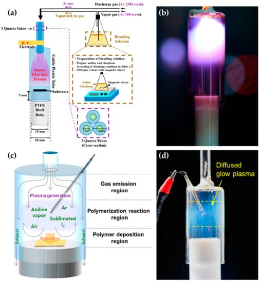 Kim et al. report a pin-type APPJ with the GB system for synthesizing a conducting polymer [63] and a transparent polymer [64]. As shown in Figure 4c, this device consists of four components: a narrow glass for gas inlet, a wide glass tube as the guide tube, a polytetrafluoroethylene stand as the bluff body, and a tungsten wire electrode to generate plasma. The tungsten wire electrode is covered with a glass capillary, with just the 2-mm tip of the wire remaining exposed. A discharge gas and a precursor are introduced into the guide tube via the gas inlet. A sinusoidal power with a peak voltage of 4–5 kV and a frequency of 30 kHz is applied through the tungsten wire electrode, forming a diffused-glow plasma for polymerization (Figure 4d).