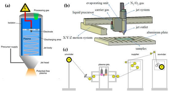 (a) The plasma jet instrument schematic (Plasmatreat AS400 with the single-nozzle-type PFW10) [65], and setup of (b) polymerization of HMDSO [67] and (c) in-line processing of carbon fiber [68].