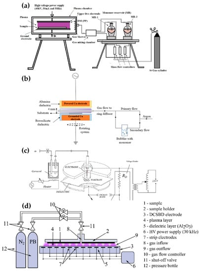 The polymerization systems using planar DBD of (a) Pandivaraj et al. [69], (b) Mertens et al. [71], (c) Getnet et al. [72], and (d) Dvorˇáková et al. [73].