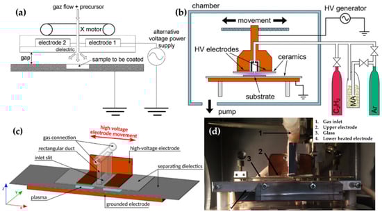 Manakhov et al. utilized a DBD plasma system to copolymerize maleic anhydride (MA) and C2H2 for carboxyl-rich coatings in a metallic cube chamber. The two rectangular pieces were separated to provide room for the gas feed, while the top electrode was covered with Al2O3 ceramics with a thickness of 1 mm, and the bottom metallic electrode (grounded electrode) was also covered with the ceramic. The gap between the top and bottom ceramics was set at 1.6 mm (Figure 7b). This chamber was pumped down, and then filled up to 96 kPa with Ar, MA, and C2H2 as a deposition gas mixture. The plasma was ignited by a sinusoidal wave with a frequency of 5–6.6 kHz and a power of 8 W [75]. Obrusník et al. and St’ahel et al. used a plasma-generating system with the same electrode configuration as Manakhov et al., albeit in open air; the gas was supplied through the inlet in the middle of the top electrode connected to a 4-cm-long rectangular duct (Figure 7c) [76]. In the work of St’ahel et al., a heating spiral was added to the bottom electrode along with a thermocouple to increase the substrate temperature, and the gap between the electrodes was changed to 1.0 mm (Figure 7d) [77].