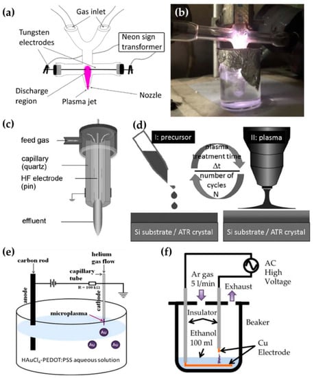 - Mariotti, D.; Sankaran, R.M. Microplasmas for nanomaterials synthesis. J. Phys. D Appl. Phys. 2010, 43, 323001. [Google Scholar] [CrossRef]