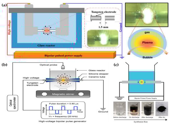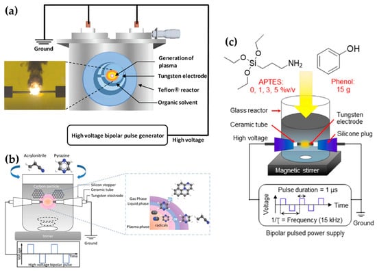 Tipplook et al. used in-solution plasma as an in situ system for the synthesis of amino-rich nanocarbons. This system had a pair of tungsten rods with a diameter of 1 mm as the powered and grounded electrodes. The electrodes were covered with an insulating tube, inserted into a silicone stopper, and placed at the center of the glass reactor, 1 mm apart. The glass reactor (Figure 11c) contained 100 mL of a liquid precursor (phenol, (3-aminopropyl)triethoxysilane, and ethanol). Then, a HV bipolar pulse power with a voltage of 4kV, a pulse duration of 1 μs, and a repetition frequency of 15 kHz was applied through the electrodes to generate the in-solution plasma [109].
