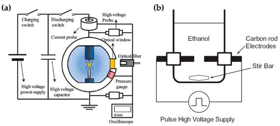 Alsaeedi et al. reported that nanocarbons were successfully synthesized by using in-solution plasma. In this paper, the in-solution plasma was generated between two carbon electrodes. The carbon rod electrodes each had a diameter of 3 mm, and were separated by a gap of 1 mm. The electrodes were immersed in 50 mL of ethanol (Figure 12b), and the pulse voltage, frequency, and pulse width were 4 kV, 30 kHz, and 4 μs, respectively [110].