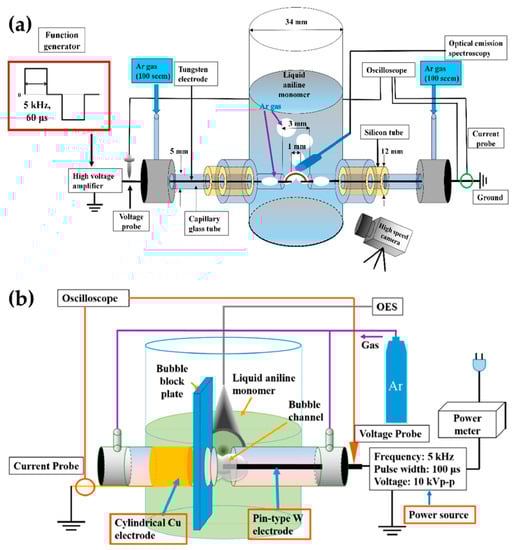 Shin et al. [111,112] added a gas bubble to the in-solution plasma system. The gas bubble was often used as a plasma channel to enhance in-solution plasma performance in pulsed discharge systems [111]. In a cylindrical glass reactor, the two tungsten electrodes were oriented 1 mm apart, and were positioned in the capillary glass tube for the Ar gas channel. The Ar gas was introduced along with two electrodes in parallel [111], thus forming a gas bubble channel between the electrodes. The gap between the glass capillaries was 3 mm. The plasma discharge was generated in a gas bubble between the electrodes in an aniline monomer acting as the liquid precursor (Figure 13a). A bipolar pulse with an amplitude of 16.4 kV and a frequency of 5 kHz was used to generate the in-solution plasma within the Ar bubble channel, and the bipolar pulse duty ratio was 60 μs [111].