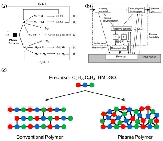 (a) Mechanisms of plasma polymerization [113]. (b) A scheme of a general plasma polymerization system [114]. (c) Comparison of a conventional polymer (left) and plasma polymer (right), derived from equivalent monomers [116].