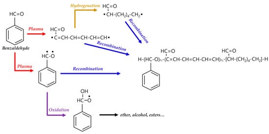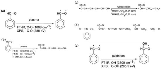 In general, the reaction mechanism of plasma polymerization is mainly established in a vacuum state or low-pressure conditions. In APP methods, the reaction scheme of plasma polymerization is not yet verified, and the related underlying mechanisms are under-studied. Nevertheless, the detailed reaction mechanism of APP polymerization can be confirmed by clearly identifying the chemical structures of polymerized films via characterization methods such as Fourier transform infrared spectroscopy (FT-IR), nuclear magnetic resonance (NMR), and X-ray photoelectron spectroscopy (XPS). The results of this analysis can be seen in Figure 15, where Asandulesa et al. reported a polymerization mechanism by identifying the chemical structures of the polymer films through the characterization of APP-polymerized films synthesized from various monomers [118]. In the case of the benzaldehyde-based polymer films, the polymerized films showed two different types of chemical structures, depending on the plasma conditions: The first type was where the aromatic ring was preserved during the APP polymerization; in this case, reactions of benzaldehyde were initiated by breaking the π bonds from aldehyde, which was confirmed by the presence of C–O bonds in the polymeric film through FT-IR and XPS spectra, as shown in Figure 15a. The second type was where the aromatic ring was broken during the APP polymerization; in this case, aliphatic functional groups were likely obtained from the aromatic ring breakage during plasma polymerization, and aliphatic hydrocarbons (CH2 and CH3 protons) were also produced by hydrogenation reactions—which was confirmed through FT-IR and NMR spectra, as shown in Figure 15b,c. Finally, the reactive species were shown to randomly recombine, and the polymeric film was obtained via the reactions between radical species during the APP polymerization, as shown in Figure 15d. The reactive species could also be oxidized during film growth, producing functional groups such as ethers, alcohols, and esters—which was confirmed by the presence of ethers, alcohol, esters, and carbonate units in the chemical composition of the polymeric film identified from FT-IR and XPS data, as shown in Figure 15e [118]. In summary, the APP polymerization mechanism, from a chemical point of view, is related to the formation of benzaldehyde-based polymer films, as illustrated in Figure 16.
