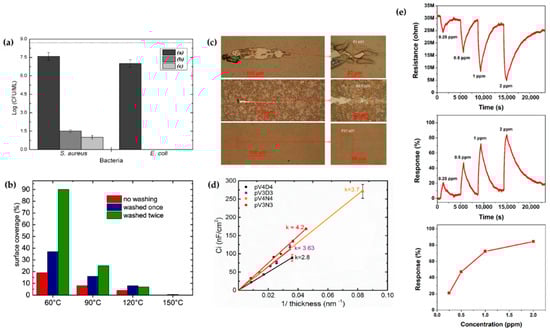 The technical state of APP polymerization is sufficiently enhanced to synthesize a conducting polymer film with single- and polycrystalline properties (Figure 17a,b) [62]. These advanced APP polymerization techniques are actively investigated for various applications; functional coatings are one such representative application of APP polymerization. Plasma polymerization can change the wettability of any surface to demonstrate hydrophobic/philic characteristics, depending on the amount of polar or nonpolar functional groups on the coating’s surface [78,81]. Therefore, the properties of functional coatings are commonly determined from the kinds of materials used. For example, TMS, APDMES, HMDSO, AA, and PMA are utilized for wettable coatings (hydrophilic/phobic) (Figure 17c,d) [57,67,71,73,78,81]. In a biological application, Getnet et al. [72] and St’ahel et al. [77] investigated whether polymer films synthesized via APP polymerization could be applied for antibacterial properties (Figure 18a,b) [72,77]. As shown in Figure 14c [116], the plasma polymers have the high cross-linking property resulting from continuous fragmentation and random recombination during plasma polymerization; that is, the polymers obtained using plasma techniques show better mechanical stability and fewer morphological changes [74,114,117]. Bardon et al. [74] reported that the DOCA polymer coatings were modified by adding HdiA or HdiMA to the DOCA precursor, and the related mechanical reinforcement was examined (Figure 18c) [74]. Abessolo et al. [82] also reported that the dielectric constant of polymer films deposited by APP could be lowered by varying the monomer precursors used—i.e., siloxane and silazane—as well as by varying their ring size (Figure 18d) [82]. Additionally, the surface morphology of the polymers obtained using APP polymerization shows rough or porous films, thereby enhancing their sensing capability as gas sensors. A porous polythiophene prepared via APP polymerization showed outstanding response properties as a NO2 gas sensor when compared to polythiophene synthesized via chemical methods (Figure 18e) [119].