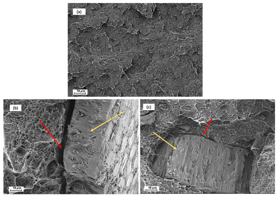 In Figure 1, the morphology of fractured surfaces from Charpy tests are shown with the aim of evaluating the effect of silane treatment on the interfacial adhesion between CSF and the matrix. As can be observed in Figure 1a, Bio-HDPE showed the typical rough and irregular surface of a ductile polymer as also reported by Rojas et al. [67]. As it has been described previously, the treatment of CSF with APS has a positive effect on mechanical resistance properties such as strength, modulus, or hardness whereas a decrease of mechanical ductile properties such as elongation at break was detected. The effect of silane treatment can be compared in Figure 1b,c at 1000× where CSF particles are highlighted with a yellow arrow. In the case of an untreated sample (20UT) a clear gap can be distinguished in the perimeter between the polymer matrix and a CSF particle highlighted by the red arrow in Figure 1b. This gap indicated the lack of particle-matrix interaction that does not allow it to transfer stress, and this justifies the decrease in elongation at break and impact energy [60]. Moreover, Toro et al. indicated that when cracks are produced by an impact, these are propagated towards the poor interfacial regions, leading a break in the composites with low stresses [68]. Regarding the treated sample (20T), the gap between the CSF particle and polymer matrix has been broadly reduced when CSF was treated with silane coupling, as has been highlighted with a red arrow in Figure 1c. This indicated that a better interfacial adhesion was achieved between the two phases. This confirms the enhancement of mechanical properties and elongation at break compared to untreated samples. Bijaisoradat et al. also observed that voids between filler and matrix was reduced when evaluating wood flour treated by trimethoxy (propyl)silane (MPS) in HDPE [69].