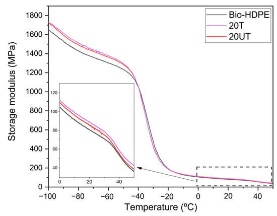 Evolution of storage modulus (G’) of bio-based high-density polyethylene (Bio-HDPE) with 20 wt.% of untreated (20UT) and treated (20T) chia seed flour.