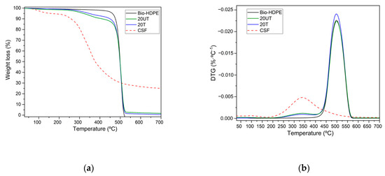 Thermal parameters of degradation of bio-based high-density polyethylene (Bio-HDPE) with 20 wt.% of untreated (20UT) and treated (20T) chia seed flour (CSF). (a) Weight loss; (b) Derivative thermogravimetry.