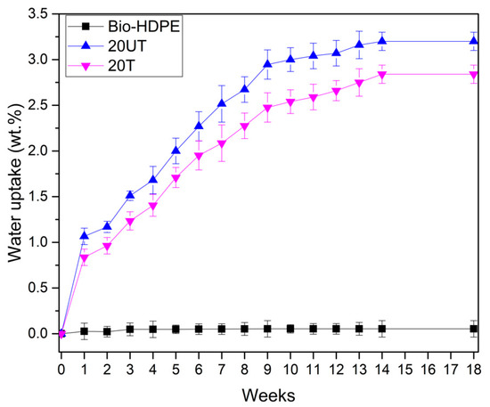 Water uptake of bio-based high-density polyethylene (Bio-HDPE) with 20 wt.% of untreated (20UT) and treated (20T) chia seed flour.