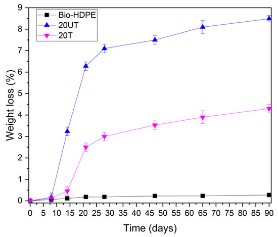 Weight loss of bio-based high-density polyethylene (Bio-HDPE) with 20 wt.% of untreated (20UT) and treated (20T) chia seed flour.