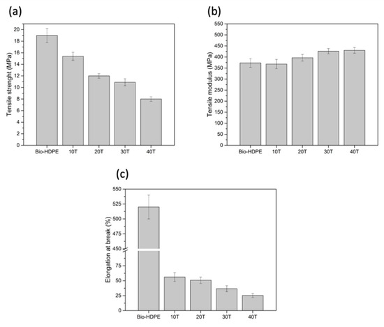 Tensile properties of Bio-HDPE with different content of CSF are shown in Figure 6. As can be seen in Figure 6a, the tensile strength decreased with increasing filler content. The lowest tensile strength recorded was 8 MPa for the 40T sample, which was a decrease of 58% compared with Bio-HDPE. This behaviour was directly related to the interfacial adhesion between CSF and matrix, which is crucial in reinforced composites to allow the tranfer of a small stress to filler particles during deformation [45]. Therefore, a higher content of filler implies less interaction between the matrix and particles, and thus more stress concentration appeared that induces the strength to decrease [85]. Regarding the tensile modulus, Figure 6b showed an increase with addition of CSF content in the matrix. In this case, the highest elastic modulus was obtained for the 40T sample, which represents an increment of 22% compared to neat Bio-HDPE. No significant difference was observed when comparing the 30T and 40T samples, indicating that a higher addition of CSF filler does not necessarily lead to an increase of elastic modulus. In addition, the increment of elastic modulus could confirm that CSF presents the rigid nature typical of lignocellulosic fillers. This trend indicated an increment of stiffness of composite due to restriction of chain mobility caused by the presence of filler particles [63]. Finally, as was shown in Figure 6c, the elongation at break of Bio-HDPE decreased dramatically as the filler content increased, going from 520% for Bio-HDPE to 23.5% for the 40T sample, respectively. This behaviour was attributed to the presence of stress caused by the dispersed rigid filler that increased the higher the filler content is [61]. This trend has also been found by Chun et al. when studying the effect of coconut shell powder (CSP) with 3-aminopropyl-triethoxysilane (3-APE) silane coupling in a PLA matrix [72]. In this study, despite the enhancement of interfacial adhesion obtained using aminosilane, a reduction of elongation at break occurred.