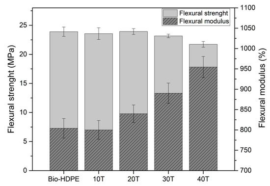 A similar behaviour was observed in flexural properties (Figure 7). As shown in Figure 7, the flexural strength decreased slightly with the addition of CSF to the matrix. Although the changes recorded are not very significant, a clear tendency was observed. The lowest flexural strength measured was 21.7 MPa for 40 wt.% of CSF, representing a decrease of 9.6% compared to Bio-HDPE with 24 MPa. With respect to flexural modulus, it was highly improved with the addition of filler. Addition up to 20 wt.% of CSF showed an increase of 4% compared to unfilled material, achieving an average value of 845 MPa approximately. However, a very similar addition of 30 wt.% showed a significant increment of 10% and 18% in flexural modulus regarding Bio-HDPE for 30 and 40 wt.%, respectively. As mentioned above, for the lowest filler content (10 and 20 wt.%) a slight increase was measured. This fact is due to better filler dispersion in the matrix as well as the substantial distance between filler particles. Nevertheless, the flexural modulus for high filler content was increased noticeably because the distance was decreased by the addition of filler and the effect of each CSF particle was superposed providing an evident enhancement [86]. In general, these tendencies were in concordance with the previously recorded tensile properties, where the tensile modulus increased, and tensile strength decreased as filler content was added.