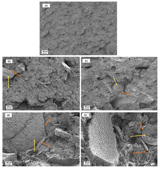 In Figure 8 the fractured surface morphology after impact tests of Bio-HDPE with different percentages of treated CSF with APS are shown in order to evaluate filler-matrix interactions. In Figure 8a the typical irregular and rough surface of a ductile polymer like Bio-HDPE is shown, where an an absence of CSF particles is observed. In general, after addition of CSF particles, highlighted in yellow arrows (Figure 8b–e), good bonding by Bio-HDPE matrix was observed. As mentioned previously, CSF particles treated with APS showed improved compatibility with matrix reducing the gap between phases. Nevertheless, as higher CSF particle addition levels, more presence of small gaps in the perimeter between CSF and the surrounding Bio-HDPE matrix was observed as marked by orange arrows. It is known that a higher presence of particles in the matrix, despite using compatibilizers, generates more voids between particles and the matrix [89]. This fact causes an increment of stress concentrators and therefore a loss of mechanical properties as was shown previously [85]. Similar findings were obtained by Garcia-Garcia et al. who evaluated different percentages of peanut shell powder (PSN) in a Bio-HDPE matrix, where despite the use of compatibilizers, some voids between particles and the matrix causing a decrease in elongation at break and tensile strength are still observed [61].
