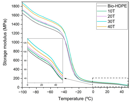 DMTA in torsion mode, plotted in Figure 9, represents the evolution of storage modulus (G’) with respect to temperature for Bio-HDPE and different composites developed with Bio-HDPE and CSF. Storage modulus, which is related to the stiffness of a material, decreased as the temperature increased for all analyzed samples. However, the addition of filler increased the storage modulus values regarding neat Bio-HDPE, with higher values as the CSF content increases. This was more clearly observed at low temperatures (−100 to −80 °C). With respect to room temperature, it was observed that the 40T sample presents a G’ of 105 MPa, which represents an increment of 20% compared to neat Bio-HDPE. This fact confirmed the reinforcing effect that CSF filler provides, which acts as an interlock point in Bio-HDPE matrix that leads to restricted chain mobility, thus increasing the stiffening behaviour of composites [63]. This trend was also measured previously in tensile and flexural modulus. In addition, a similar behavior has been reported by Barczewski et al. [20] who evaluated different linseed cake (LC) percentages in HDPE composites. In this study, an increase of G’ with addition of LC was also observed, being more noticeable at low temperatures.