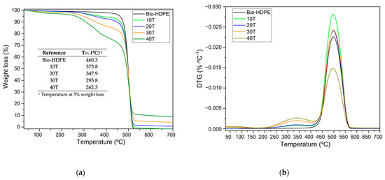 In Figure 10 both TGA curves and their first derivative (DTG) of different composites developed with Bio-HDPE and CSF are plotted. Bio-HDPE presented a temperature for a weight loss of 5 wt.% (T5%) of around 460.3 °C. The addition of CSF particles in the Bio-HDPE matrix led to a decrease of T5% as CSF filler was added. As shown in Figure 10a, T5% was reduced from 460.3 °C (Bio-HDPE) to 262.3 °C for the 40T sample, which means a decrease of 43%; hence, reduced thermal stability compared to neat Bio-HDPE. This decrease of T5% is due to the decomposition of the lignocellulosic filler produced in the 220–410 °C range, as exposed previously. In addition, a higher temperature of 410 °C was related to Bio-HDPE degradation, not showing significant changes. Finally, the residual weight recorded from 520 °C to 700 °C, was higher as CSF filler was added, probably due to the presence of more ash content [92]. In Figure 10b the first derivative is shown, where two maximum degradation stages in composite reinforced with CSF are clearly observed. The first stage (Tmax1) was related to CSF filler degradation which occurred at about 338 °C, and the second stage (Tmax2) with Bio-HDPE degradation at 498 °C. As can be observed, the addition of CSF to the matrix does not affect the Tmax1 and Tmax2. Similar findings have been reported by Yong et al. [93] for wood plastic composites using polyethylene and wood fiber with different formulations.