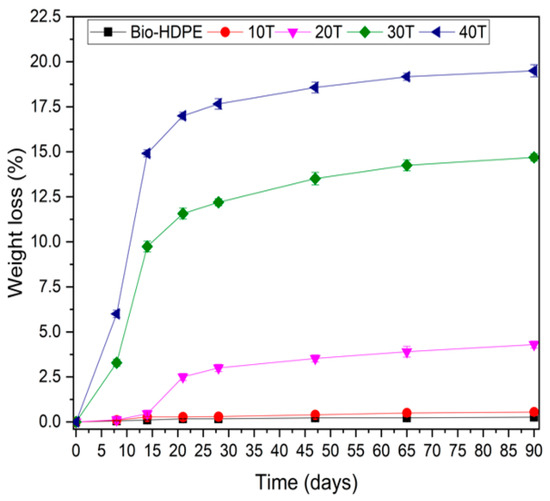 Weight loss of bio-based high-density polyethylene (Bio-HDPE) with different weight percentage of treated chia seed flour with APS.