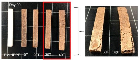 The disintegration process of Bio-HDPE with different percentages of CSF is plotted in Figure 13. As it was mentioned previously, Bio-HDPE is a non-biodegradable polymer and no sign of weight loss was recorded after 90 days. The absence of hydrolyzable zones in its structure that can be attacked by microorganisms means that after 90 days of testing, the disintegrated mass is almost nil. However, the addition of CSF filler, as expected, increased the disintegration rate up to 6% weight loss after only 8 days for a 40T sample. It is known that lignocellulosic filler, which is composed of lignin, hemicellulose and cellulose, is biodegraded by microorganisms [84]. Disintegration weight loss was greatly increased up to 21 days with addition of filler, where 16.5% of weight loss was measured in the 40T sample. However, from 21 to 90 days only a slight increase from 16.5% up to 20% was shown by the 40T sample. The applied standard, ISO 20200, establishes that any substance from developed composites that is able to pass through a 2 mm sieve is considered as a degraded material. These disintegrated materials are composed mostly of lignocellulosic fillers and possibly microplastics. The eventual microplastic formed may be further degraded by other additional mechanism such as thermo-oxidative or photo-oxidative degradation, leading to formation of a more hydrophilic layer then suitable for microorganism degradation [101]. This last mechanism will take a longer time as well as will depend on abiotic factor before microorganisms can assimilate it. Therefore, following the definition of biodegradable polymer established by the UNE EN 13432 standard, which establishes that the disintegration rate after 90 days of testing must be greater than 90% by weight, the composite developed cannot be considered as totally biodegradable, but it can be considered partially biodegradable. Another crucial aspect was the visual appearance of composites after 12 weeks, which is shown in Figure 10. With the addition of CSF, the appearance change was more noticeable due to the disintegration rate compared to the initial day (Figure 14), and 30T and 40T samples displayed a more brittle aspect. Therefore, it could be concluded that, although is not considerable a fully biodegradable WPC, it is partially biodegradable.