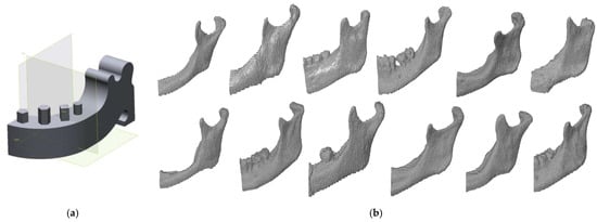 The template of the mandibular (Figure 4) also verified the Benchtop CT160Xi (Nikon) system. The structure of the iso-voxel during measurements was characterized by the size of the pixel 0.050 mm × 0.050 mm and the layer thickness 0.050 mm. The geometry of the model was reconstructed using ITK-Snap software. The segmentation process was carried out using the region growing method. The 3D model was visualized using the isosurface method. Measurement of the template was carried out five times while maintaining the repeatability conditions. The difference between the maximum (0.050 mm) and minimum (0.030 mm) value of the standard deviation was approximately 0.020 mm.