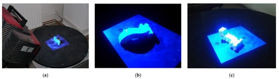 The measurement procedure performed on the Atos III Triple Scan system: (a) the measurement system; (b) measurement of the outer part; (c) measurement of the internal part.