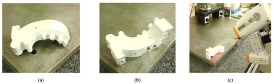 In the case of a laser scanner, an accuracy test is determined by scanning a plane from various directions. The result is the maximum standard deviation of the scan data to fitted plane features. The best-fit plane is calculated according to the least-squares method. The measurement procedure of the template used three measuring steps. The first step focused on measuring the outer part (Figure 3a) and the second on the internal part (Figure 3b). The third step was to measure the places on the external and internal surfaces that could not be measured in the first and second steps (Figure 3c). The resolution of the data during the measurement of the template model was 0.050 mm. Then, three measured geometries representing a cloud point were fitted in Focus Inspection software using the best-fit algorithm to present the final template model. The measurement process was repeated five times to assess the repeatability. The difference between the maximum (0.020 mm) and minimum (0.015 mm) value of the standard deviation was approximately 0.005 mm.