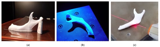 Along with modern manufacturing methods, more demands are placed on coordinate metrology, which concerns assessing the accuracy of manufacturing 3D models [48,49,50,51]. Most often, in the process of determining the accuracy of a geometry, coordinate measuring machines (CMM) [52,53,54] or articulated arm coordinate measuring machines (AACMM) [55] are used. However, in models with very complex geometry (such as anatomical structures), the measurement using tactile methods is very time-consuming or impossible to carry out. Therefore, in such cases, optical coordinate measuring systems such as structure light (SL) [56,57,58], laser scanner (LS) [59,60], or micro computed tomography (μCT) [61,62,63] are used. Accuracy tests of optical measurement systems are mainly carried out by VDI/VDE 2634, ASME B89.4.22, and VDI/VDE 2630 Blatt 1.3 standards [64,65,66]. In assessing the accuracy of optical coordinate measuring systems, traditional standards such as ball bar or flat plane are used. Currently, there are no present studies of new solutions of measures that would allow the preparation of measurement procedures to check the optical measurement errors in terms of a specific type of geometry (such as anatomical structures) and the material used. Moreover, no comparative research has been undertaken to select which of the optical systems allows to obtain the most reliable results assessing the mandible’s accuracy of 3D printing models. The knowledge regarding estimating manufacturing errors of melted and extruded methods can help with the controlled preparation of templates and surgical instruments regarding the accuracy expected during operations. It can also provide significant support in the procedures to restore the continuity of the mandible geometry.