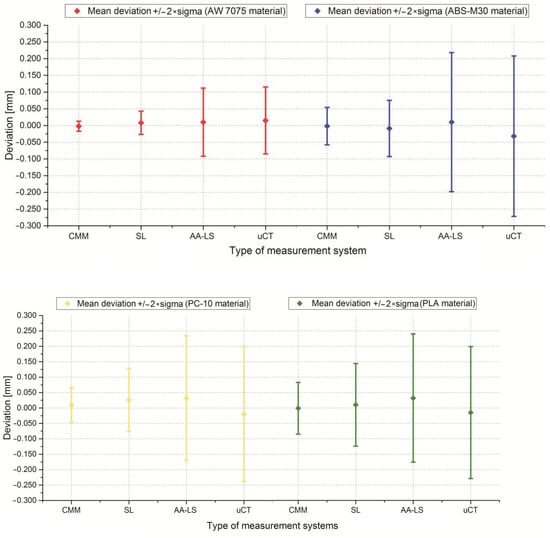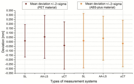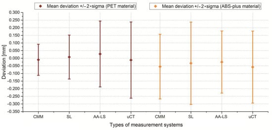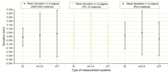 The final stage of the research was to estimate the accuracy of 12 anatomical models of the left side of the mandible, manufactured using five types of polymer materials: ABS-M30, PC-10, PLA, PET, and ABS-plus. The average results are presented in Table 5 and Table 6 and Figure 7, Figure 8 and Figure 9. The procedure used three optical systems to assess the accuracy of the manufacture of anatomical models. The same measurement procedure was used as in the case of the template model. In the process of assessing the normality of the data, the Shapiro-Wilk test was used. The evaluated values for all distributions (Figure 7, Figure 8 and Figure 9) are higher than the critical value; as a result, we did not reject the hypothesis of normal distribution. Accordingly, all obtained distributions were treated as usual.