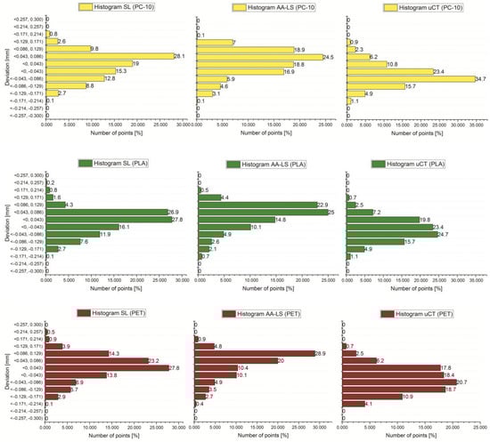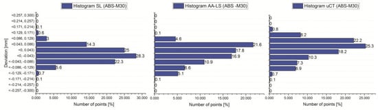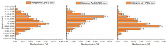 In the Benchtop CT160Xi, it was noticed that models manufactured using the PLA material (−0.028 mm ± 0.210 mm) obtained the best accuracy results; the worst were obtained in the case of ABS-M30 material (Table 5 and Figure 7). The results are characterized by small and medium positive skew (Figure 8 and Figure 9 and Table 6). It can be observed that most data distributions are mainly leptokurtic, except the models manufactured using the ABS-M30 material (Figure 8 and Figure 9 and Table 6). In each analyzed result obtained on the Benchtop CT160Xi (Nikon), unimodal distribution was observed (Figure 8 and Figure 9).