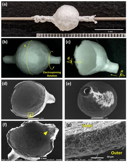 PHBH fiber was electrospun on an alginate bead fixed on a wire (Figure 1a). To reveal the outer and inner structural morphology of the fabricated hollow nanofiber-mâché balls after the washing process, two semi-spheres were observed using digital microscopy (Figure 1b,c). The actual inner and outer diameters of a nanofiber-mâché ball were found to be approximately 3.8 and 4.1 mm, respectively. The interior of the ball, corresponding to the microenvironment where cells reside in tissues, had a volume of 230 mm3. The two ducts formed after the core aluminum wire was removed, located at opposite sides of the hollow ball, had inner diameters of approximately 0.58 mm; they can be used to access the interior for injection of cell suspension. Fine structures were observed in detail by SEM. In a sectional view of the nanofiber-mâché ball, it was evident that the inner and outer structures were distinct. The inner fibers were spun randomly to form a smooth surface (Figure 1d), whereas the outer fibers were spun along the circumferential direction (Figure 1e). Longitudinal-section observation of a nanofiber-mâché ball and duct showed details of the interface between the central sphere and duct on both sides (Figure 1f, arrowhead). The cross-section of the wall showed the geometric difference between the inner and outer surfaces (Figure 1g). The thickness of the inner layer was approximately 60.5 μm, while the outer layer was 53.9 μm in thickness. The total thickness of the wall was 114.4 μm.