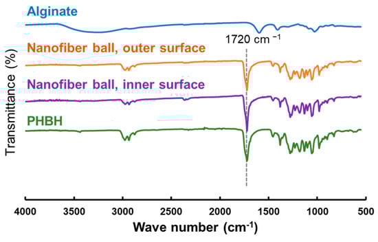 ATR-FTIR spectra of the alginate, inner, and outer surface of nanofiber-mâché ball, and PHBH.