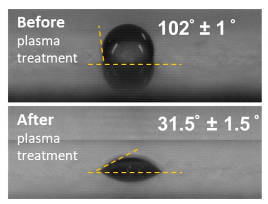 To show the improvement of surface hydrophilicity by oxygen plasma treatment, water contact angles of electrospun PHBH fiber sheets were measured by a sessile drop method (Figure 4). The water contact angles before and after plasma treatment were 102° ± 1° and 31.5° ± 1.5°, respectively. This result shows that oxygen plasma treatment hydrophilized PHBH, a hydrophobic polymer.