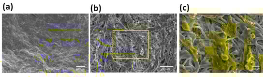 SEM images of U-251 MG culture on fibronectin coating nanofiber-mâché ball for 72 h. (a) Cells adhered to the inner surface, where the fibers were randomly oriented, at low magnification observation. (b) The adhesivity of uniform cells onto the inner surface (c) contributed to forming an adepithelial layer, at two magnifications. (Yellow in false-color image: cells).