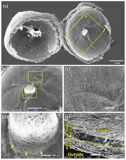 To reveal the dimension and geometry of electrospun nanofiber, the inner and outer surfaces were observed under high magnification (Figure 2a,b). The fibers on the inside were random; they were fused to each other as if they were pressed, because they were spun on the surface of alginate gel beads. The fibers were densely packed and adhered to each other, especially in the inner random region. Therefore, there was not enough space for cells to penetrate through the wall, although it was porous. This indicates that nutrients and oxygen can be supplied from the outside, but cells can migrate only through the duct.