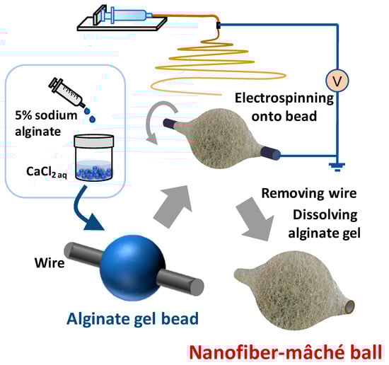 Conceptual illustration of the fabrication of nanofiber-mâché ball based on alginate gel beads.
