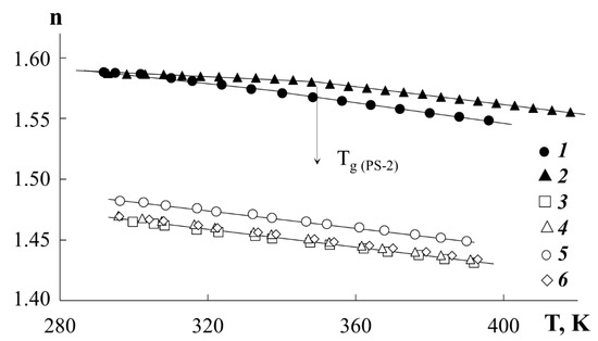 Refractometry. Information about the temperature dependences of the refractive indices of polymers is of fundamental importance in interpreting the optical density distribution profiles in the interdiffusion zone. The temperature dependences of the refractive index for polyacrylates and polystyrenes were determined by preliminary experiments (Figure 1). The measurements were carried out on an ATAGO NAR-2T refractometer (ATAGO CO., LTD., Tokyo, Japan) in the temperature range from 290 to 430 K. For all investigated components, linear temperature dependences of the refractive index were observed. In this case, the numerical values of the refractive index for PEA, PBA, and PEHA are close to each other, while for PMA they are somewhat higher. Curves 1 and 2 (Figure 1) clearly show a characteristic break in the curves corresponding to the glass transition temperature of the PS. In the range 370 to 430 K, a large difference is observed in the values of the PS-1 and PBA refractive indices for example (Δn is about 0.119). An increment of the refractive index per interference strip equal to ~ 0.025 provides a sufficiently high sensitivity in identifying changes in the composition in the phase conjugation zone. This information is of fundamental importance in calculating the compositions of coexisting phases in systems with amorphous separation.