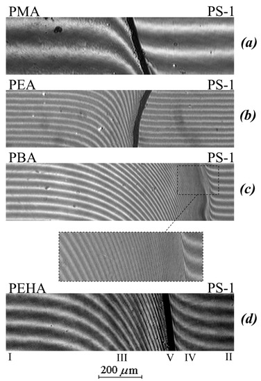 An increase in the molecular weight of PS to 4 × 103 and a transition to other polyacrylates (PMA, PEA, PEHA) change the structure of the transition region of phases conjugation (Figure 2a,b,d). In the middle region of the compositions of the PS–PMA, PS–PEA, PS–PBA, PS–PEHA systems, there is an interphase boundary separating the region of dissolution (diffusion region) of PS macromolecules in the polyacrylate phase (to the left of the phase boundary) from the region of dissolution of polyacrylate macromolecules in the polystyrene phase (to the right of the phase boundary), which indicates the limited solubility of the components. For example, the interdiffusion zone for samples with PS-1 at temperatures from 363 to 433 K is a superposition of three regions: the regions of pure PEHA and PS components (I and II, respectively), the interphase boundary (V), and the regions of PEHA dissolution in PS (IV) and PS in PEHA (III). A similar situation is observed in the PMA–PS, PEA–PS, PBA–PS-2 systems. It is interesting to note that the solubility of PA in PS is characteristic only for the PEHA–PS-1 system (Figure 2d) while the diffusion of PMA and PEA in PS is extremely weak (Figure 2a,b). Such systems are usually referred to as systems with one-sided diffusion. [28,30]. Similar interference pictures and distribution profiles of the composition were observed at lower temperatures of the interdiffusion process.
