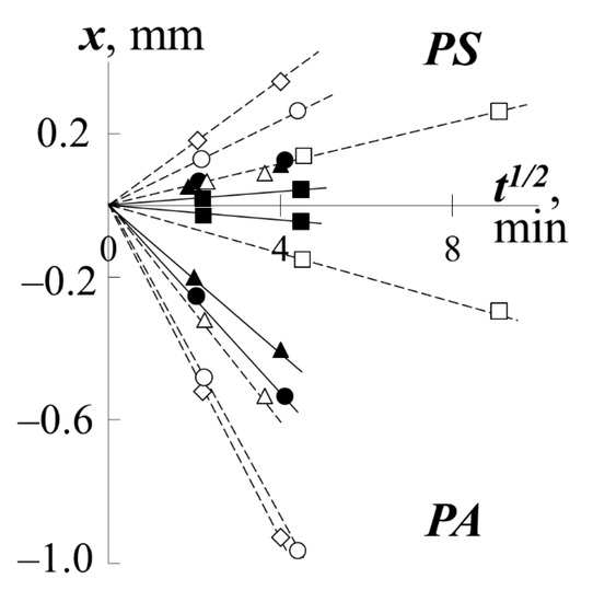 In contrast to the interphase (V in Figure 2d), for the regions of spontaneous mixing of components III and IV, a continuous change in time was recorded in both their sizes and the concentration distribution profile. In this case, each point of the concentration profiles changes its position on the diffusion coordinate (X) strictly in accordance with the diffusion law X–t1/2 (Figure 4), i.e., the diffusion mechanism of polymer mixing is observed.