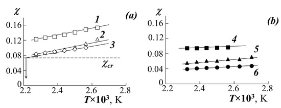 • Then, the temperature dependences of the pair parameter were plotted in the coordinates χ–1/T (Figure 6), which were extrapolated to the values of χcr. The point of intersection of these lines was taken for UCST.