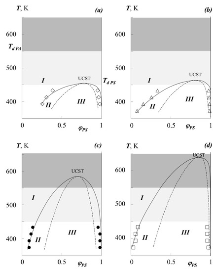 Figure 7 shows the generalized (complete) phase state diagrams, information about the UCST, critical compositions for the studying systems. It can be seen that UCST for mixtures of PS with PMA, PEA, PEHA is in the region of the onset of thermal degradation of oligomeric polystyrene (light gray zone) or acrylates (dark gray zone). It should be especially noted that the data on the thermal destruction of polyacrylates vary greatly. Thus, our studies on thermogravimetry have shown that a noticeable loss of polymer mass begins above 550 K, but at the same time, some structural changes can manifest themselves at 430 K. However, according to the data [12], PBA can undergo significant changes even when the temperature reaches 400 K.