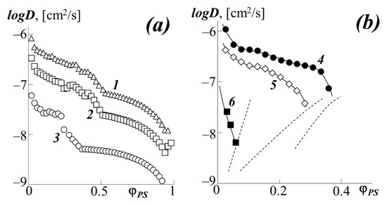 An analysis of the concentration dependences of the interdiffusion coefficients showed that, when going from PS-1 to PS-2, its translational mobility in the PBA matrix significantly decreases (the numerical value of logD at φPS = 0.1 decreases from −6.4 to −7.1). In this case, the concentration dependence of the diffusion coefficient for the PBA–PS-2 system has a discontinuous character when approaching the region of phase decomposition of the system. The dependences for the diffusion of PS-1 into the matrix of various acrylates look similar (Figure 9b). Upon transition in the homologous series PBA → PEA → PMA (curves 1, 5, and 6, respectively), one can observe a decrease in the numerical values of logD by two orders of magnitude. There is also noticeable inflection and discontinuity of the curves at concentrations near the binodal curves (marked with a dashed line). It is interesting to note that up to φPS = 0.3, the PEHA–PS-1 system (curve 4) shows the same logD values and the same character of the curve as the PBA–PS-1 system (curve 1). At φPS > 0.3, instead of a monotonic decrease in the diffusion coefficient, as in the case of PBA, we see its sharp drop for PEHA in front of the binodal curve.