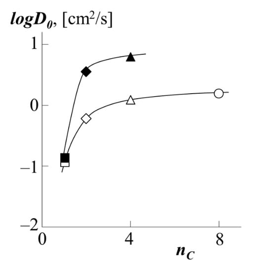 To carry out a quantitative comparison of the effect of the type of polyacrylate on the translational mobility of PS macromolecules in it, by analogy with [34,35], we used such a parameter as the number of carbons nC in the side chain (functional group). The value of this parameter changes in the order PMA → PEA → PBA → PEHA as 1 → 2 → 4 → 8. Figure 11 shows the corresponding dependence of the diffusion coefficients. It is clearly seen that with an increase in the side chain length by one fragment (PMA → PEA), there is a sharp increase in the diffusion coefficient both for PS-1 as a diffusant and for PS-2 one. In the case of the transition from PEA to PBA, and then from PBA to PEHA, the dynamics of the growth rate of PS migration into the polyacrylate matrix are not so high. We assume that this is due to the conformational features of the packing of polyacrylate chains with different side chain lengths. Following [35], we assume that the short methyl group of PMA does not prevent dense packing of macromolecular coils. Longer fragments of side radicals of ethyl and butyl groups form a looser macromolecular coil of polyacrylate, which in turn increases the vacancy volume of the matrix and facilitates the migration of PS macromolecules into it. The same fact is indirectly indicated by the calculated values of the density of polyacrylates (Table 1). It is especially worth noting that the dependence shown in Figure 11 has a similar form in the coordinates logD–(T-Tg), where (T-Tg) is the difference between the experiment temperature and the glass transition temperature of PA.