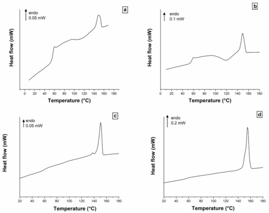 The behavior of additive manufactured neat PLA was investigated before and after immersion. Figure 1 presents the MT-DSC responses of amorphous and semi-crystalline PLA that were immersed for 2 months. By comparing first the two amorphous PLAs (Figure 1a,b), one can observe that both signals exhibit the same characteristic events, the endothermic step associated with the glass transition, the exothermic peak of cold-crystallization, and finally the endothermic peak of melting. In both cases, the enthalpies of cold-crystallization and melting are equal, proving that PLA stays amorphous after immersion. However, the enthalpy of cold-crystallization is higher when the PLA is immersed. This shows that the nucleation has been enhanced. Regarding semi-crystalline PLAs (Figure 1c,d), the absence of cold-crystallization peak reveals that both samples reached their maximum degree of crystallinity Xc. As expected, the amplitude of the glass transition decreases in both cases in comparison with amorphous PLAs since the content of the amorphous phase is lower. PLA crystallized at 135 °C exhibits only a melting peak, which is attributed in literature to the melting of α crystals formed at high crystallization temperature [14]. On the other hand, the behavior of the PLA crystallized at 80 °C is not what is usually reported. Most often, one can see a low-intensity exothermic peak that precedes the melting peak. This is the signature of the reorganization of imperfect α’ crystals formed at low crystallization temperature into α crystals, which subsequently melt [15]. In the present study, a double melting peak is recorded. Such calorimetric response has previously been observed in neat PLA annealed in a furnace [12]. It is assumed that the crystallization process is heterogeneous and that thermal gradients exist through the material thickness. Thus, the double peak is interpreted as the signature of the coexistence of α’ and α crystals.