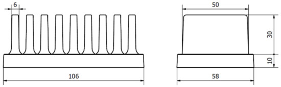 The tested heat sinks had dimensions (58 × 40 × 106) mm with 9 fins (details are shown in Figure 1). For the study’s purpose the chosen design was simplistic to allow an easy way to calculate dissipated heat through the heat sinks’ fins according to [17]. Heat sinks were produced from Polyamide 66 as the matrix material with graphite flakes as the main filler that ensured the high thermal conductivity. This blend is commercially available and was produced by Avient (Prague, Czech Republic). The thermal conductivity of this material ranged from 5 to 20 W/m·K depending on the filler orientation, density 1640 kg/m3. The heat capacity is unknown (not essential because the data presented in this paper is for the thermal steady state). All the values were taken from the official data sheet.