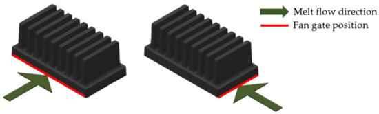 To compare the influence of the melt flow, two polymer heat sinks of the same geometry were used in the measurement. The difference between the two heat sinks was in the melt entry point during production. One heat sink was produced with the melt entry along the heat sink’s longer base’s edge so the melt would flow in parallel with the heat sink’s fins and the other had the melt entry on the shorter base’s edge perpendicular to the heat sink’s fins. Entry points of both measured heat sinks are shown in Figure 2.