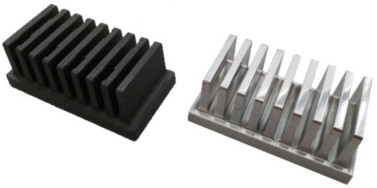 Furthermore, an aluminum heat sink of the same geometry was also compared with the two polymer heat sinks. The aluminum heat sink had thermal conductivity 130 W/m·K and a low surface emissivity. One of the measured polymer heat sinks with high emissivity and the aluminum heat sink with low emissivity are shown in Figure 3.