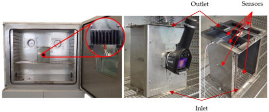 The measured polymer heat sinks were situated inside a measurement box, which was placed inside a thermostatic chamber Binder MK 720 (manufacture Binder, Hradec Kralove, Czech Republic) during the conducted measurements. The box with one of the measured heat sinks inside the thermostatic chamber is shown in Figure 4. The box’s holders touched the heat sinks only in four points to ensure minimal heat conduction away from the heat sinks and into the box itself. The thermostatic chamber served as the source of the desired ambient temperature and the box protected the heat sinks from any unwanted forced convection created by the chamber’s fans. The box’s front door also served as a placement of the FLIR E5 thermographic camera.