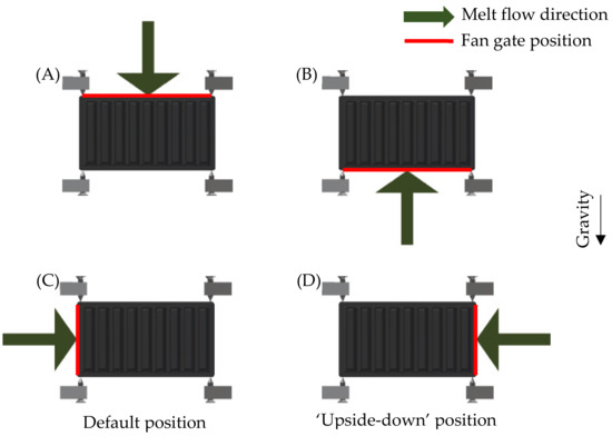 Both measured polymer heat sinks were measured in two positions as in [12]. The positions were named ‘default’ and ‘upside-down’. This led to change of the filler orientation in relation to gravity and therefore buoyancy in case of the polymer heat sink with the melt entry point parallel to the fins, which as was shown in [12] led to different cooling efficiencies. Change of the melt flow direction in regard to gravity is shown in Figure 6.