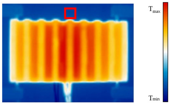 When a steady state of the measurements was achieved a thermal camera FLIR E5 with measurement precision of ±2 °C and with resolution of 120 × 90 pixels was used to further analyze the temperature field on the heat sinks’ fins. To further increase its precision another type K thermocouple calibrated the same way as the previous one was placed in the back wall inside an area which was seen in all the measurements. As this wall was dyed with a graphite spray of known emissivity the thermal imagery results could be further adjusted by comparing its values inside the area where the thermocouple was situated. This area is shown in Figure 7.