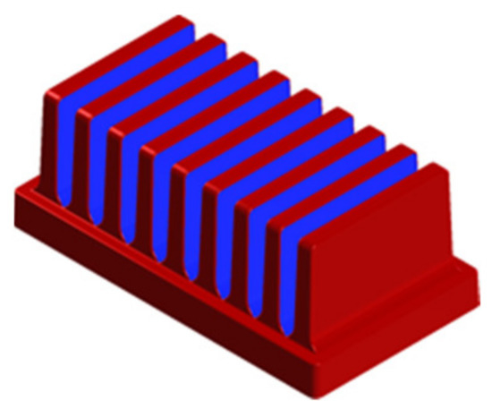 For the fins’ surface that radiated heat between themselves a view factor was calculated. Figure 8 shows the surfaces where the view factor was considered (blue) and where it was not (red). The outer surfaces without taking view factor into account formed together an area of 18,963 mm2 and the internal surfaces where the view factor was considered created together an area of 23,331 mm2, which is 55.2% of the entire surface. This means that less than a half of the heat sink’s surface can radiate heat away freely.
